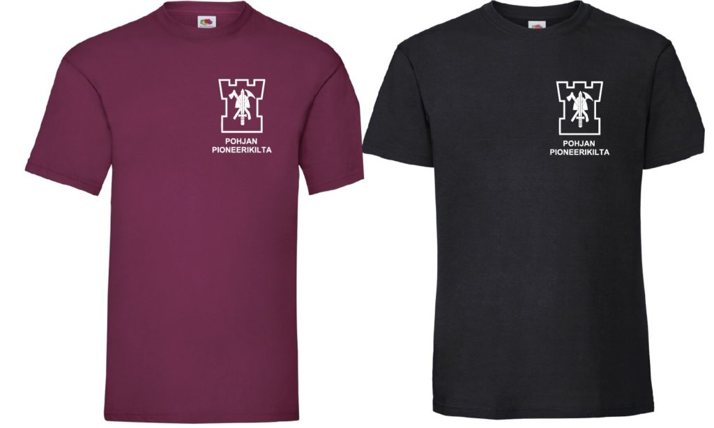 Paidoista saatavilla värit musta, vihreä ja violetti. Paidoissa Pohjan Pioneerikillan logo. Paita koot ovat: M, L, XL, XXL ja 3XL.